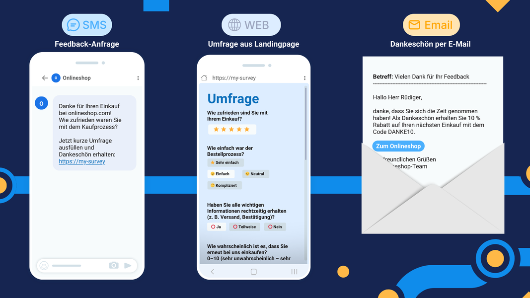 Auch Feedback kann ein starker Conversion-Hebel sein, vor allem, wenn es zur richtigen Zeit über die passenden Kanäle abgefragt wird. Nach einem Kauf im Onlineshop erhält der Kunde zunächst eine kurze SMS mit einem Dank und der Bitte um Feedback zum Kaufprozess. Der Link führt zu einer kurzen Umfrage auf der Website oder einer Landingpage, die bequem am Smartphone ausgefüllt werden kann.