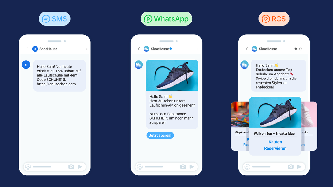 | RCS | Rich Media (Bilder, Buttons, Karussells) • Interaktiv • Darstellung im Standard-Messenger | Noch nicht auf allen Geräten verfügbar • Abhängigkeit von Netz & Gerät | Für interaktive Kampagnen, Produktvorstellungen, Buchungen oder als Upgrade zur klassischen SMS |