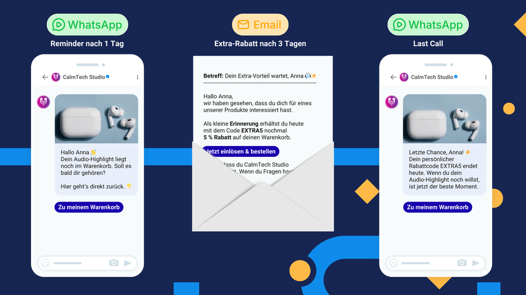 Nach einem Tag kann eine personalisierte WhatsApp ein erster Reminder sein. Nach 2 weiteren Tagen erhält der Kunde eine Mail mit einem kleinen Extra-Rabatt. Einige Tage später kann er zweite WhatsApp als Last Call für seinen Rabatt erhalten. Die Kanäle passen sich den Vorlieben des Kunden an und erreichen so eine höhere Akzeptanz.