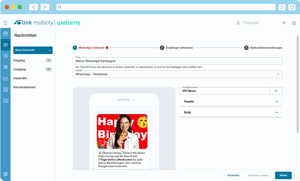 Mit websms von LINK Mobility lassen sich SMS, WhatsApp und RCS zentral über ein einziges nutzerfreundliches Messaging Portal steuern. Kampagnen können kanalübergreifend geplant, automatisiert ausgespielt und in Echtzeit ausgewertet werden. Statt Nachrichten manuell in mehreren Tools zu versenden, arbeiten Sie in einer Oberfläche und behalten alle Kontakte, Inhalte und Ergebnisse im Blick.